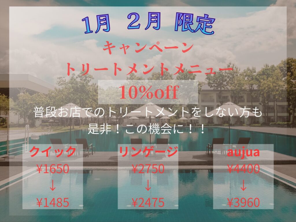 CONTENTS コンテンツ 2026.01.21 キャンペーン ブログ 寒い時期が続いていますね!皆様いかがお過ごしでしょうか? さて、今オススメのキャンペーン情報です!トリートメントメニュー10%のお得なキャンペーン中です!! 乾燥やダメージ対策をしっかりとしてより良い髪を!髪は日々の扱い方で状態が大きく左右されます!積み重ねの努力がとても大切です!! 一覧へ戻る